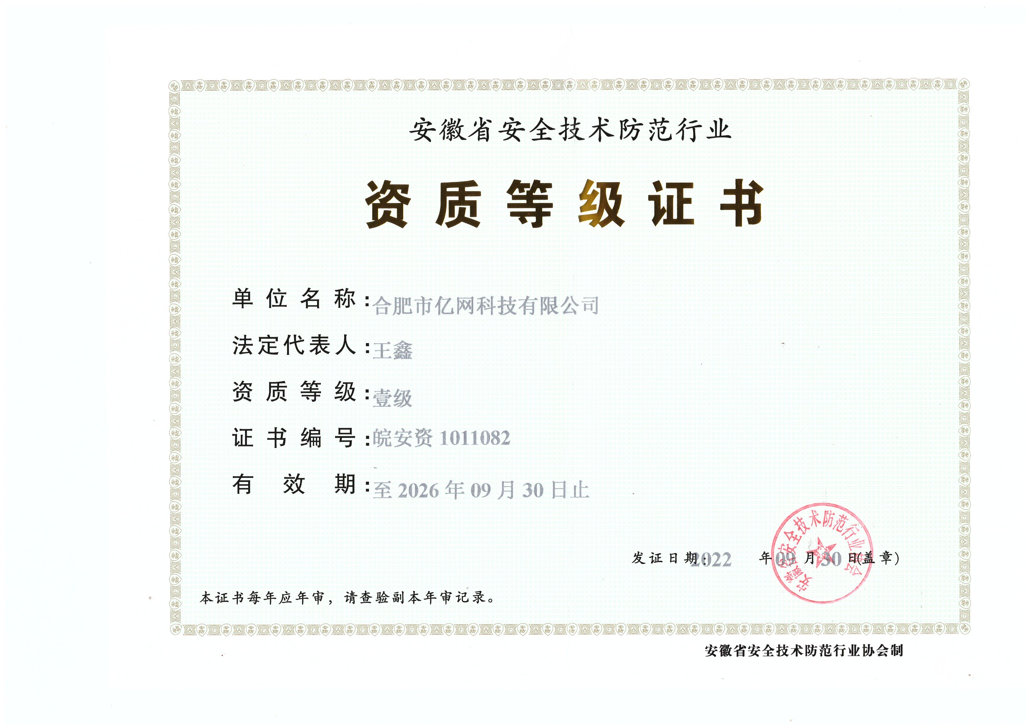 安徽省安全技術(shù)防范資質(zhì)等級(jí)證書