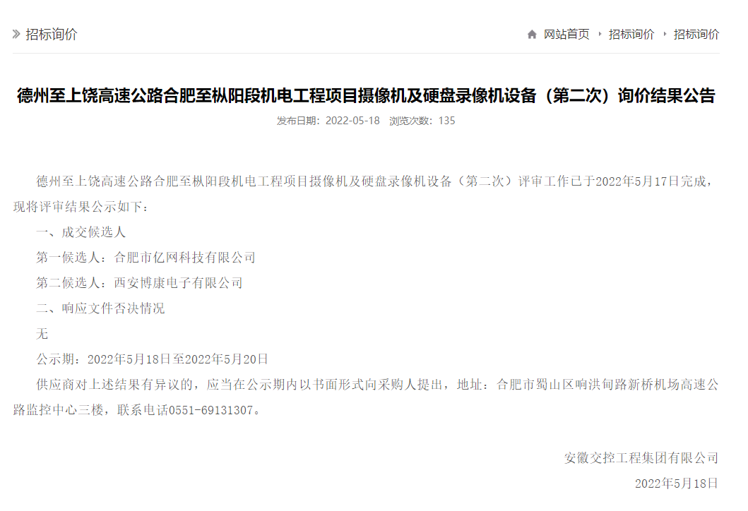 5月18日,再傳捷報(bào),合肥市億網(wǎng)科技有限公司在眾多的競(jìng)爭(zhēng)者中經(jīng)過(guò)公司各部門(mén)相關(guān)人員團(tuán)結(jié)一致、齊心努力,憑借過(guò)硬的技術(shù)實(shí)力、良好的信譽(yù)和豐富的項(xiàng)目經(jīng)驗(yàn)贏得了業(yè)主和評(píng)標(biāo)委員會(huì)的肯定,我公司在競(jìng)標(biāo)中兩次擊敗競(jìng)爭(zhēng)對(duì)手,最終中得安徽交控工程集團(tuán)有限公司《德州至上饒高速公路合肥至樅陽(yáng)段機(jī)電工程項(xiàng)目》。